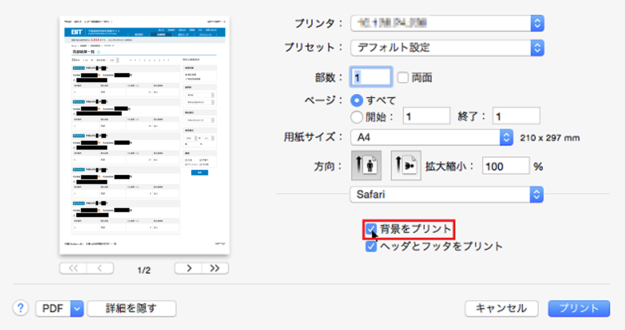 - 「詳細」ウィンドウの「背景をプリント」にチェックを付ける。